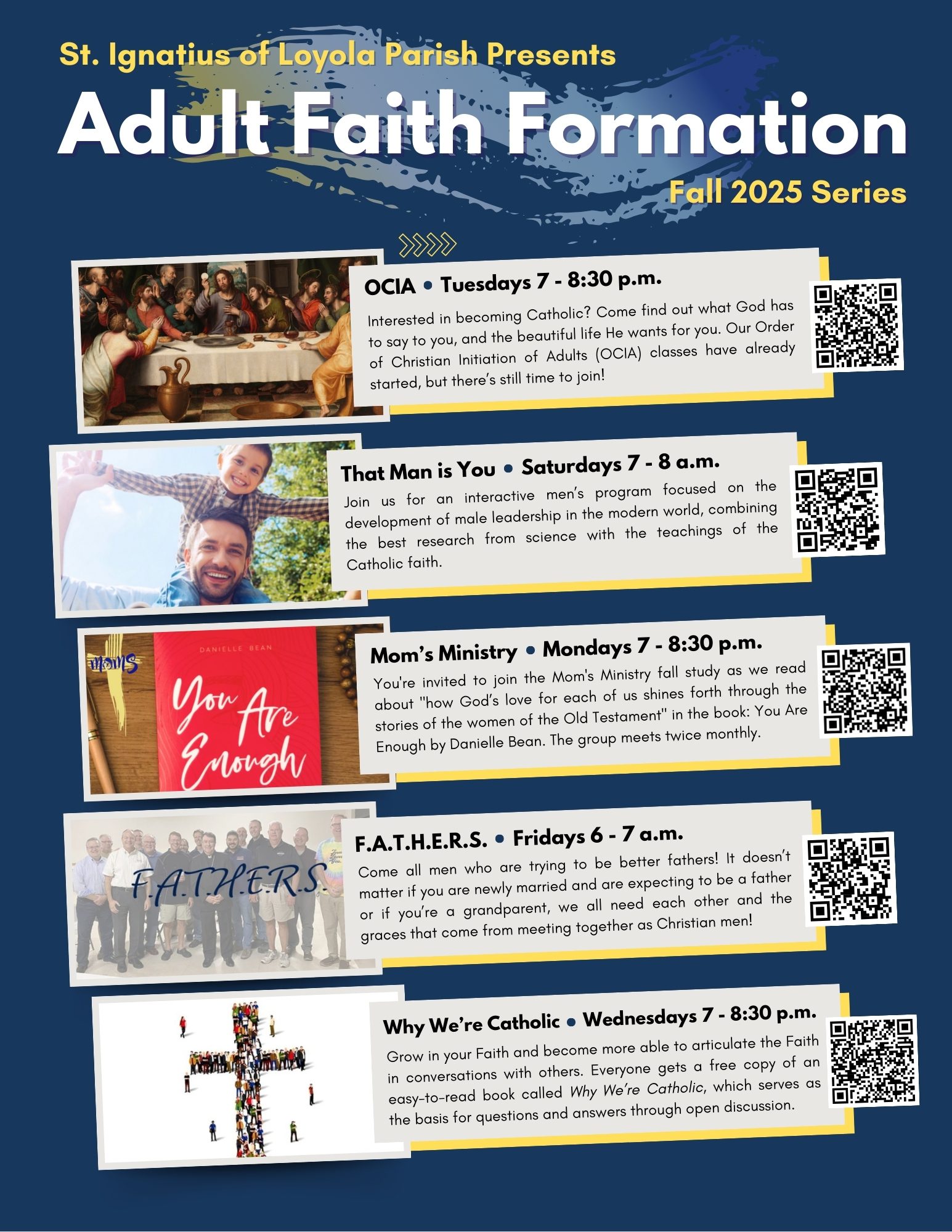Adult Faith Formation Home / Adult Faith Formation Adult Faith Formation Fall 2025 Series That Man Is You! Fathers Men’s Prayer Group Spirit and Faith Book Discussion Group Why We’re Catholic Bible Study
