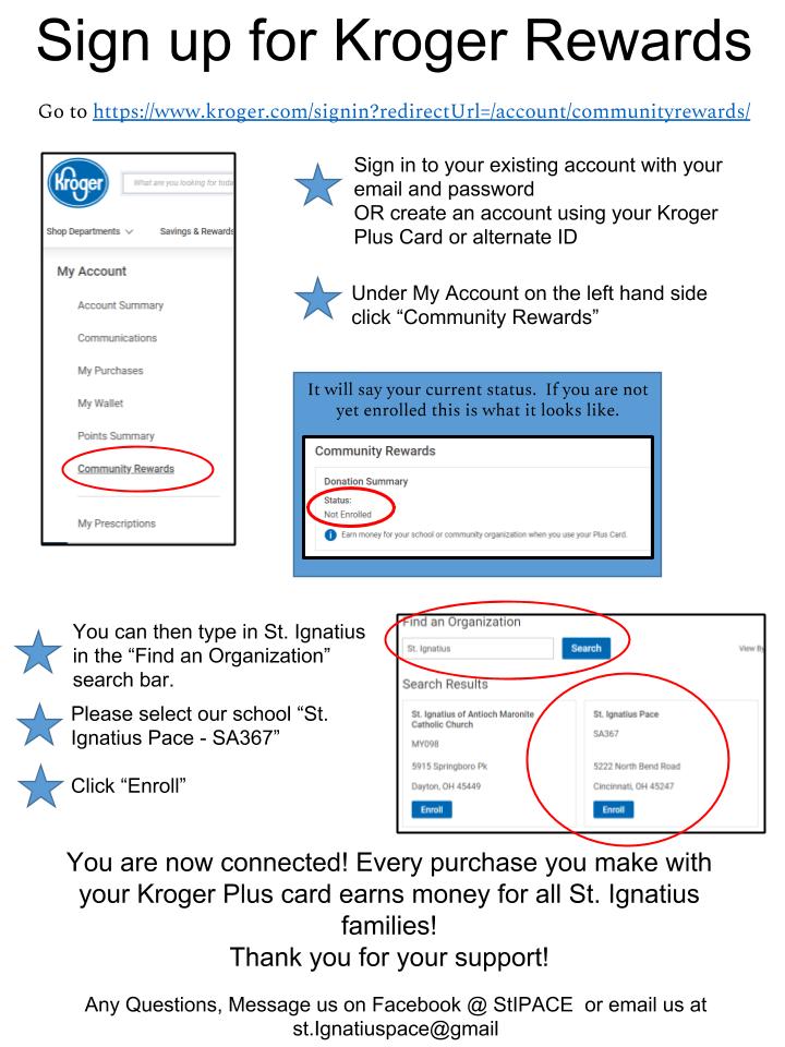 This is an easy way that you can help earn money for St. Ignatius. All you have to do is follow the simple steps to complete the sign-up one time in order to link St. Ignatius to your Kroger Plus card. Then, every purchase you make automatically earns money for the school, at no extra cost to you!